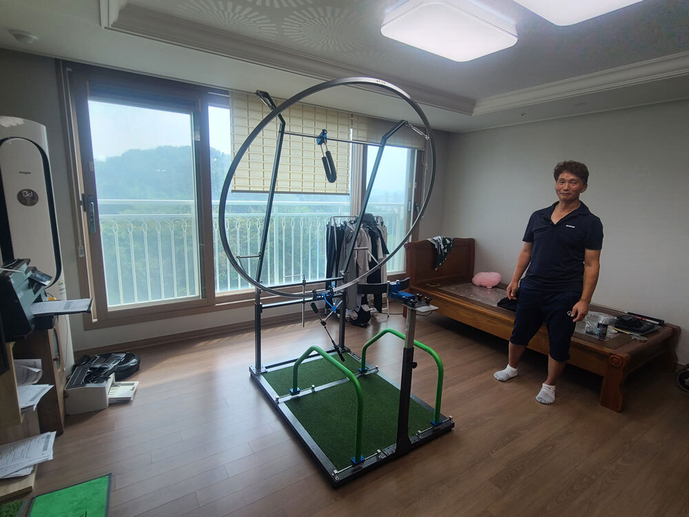 아파트 거실에서 프로스윙머신으로 궤도와 자세를 교정 합니다.